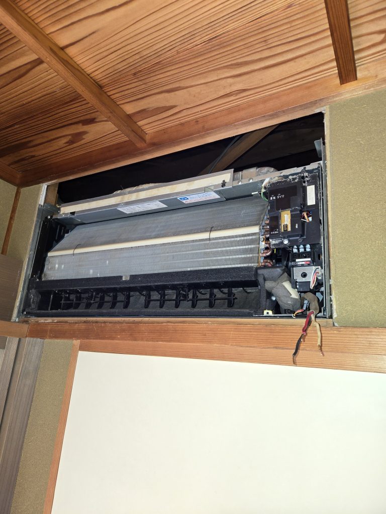 令和6年11月(由布市)某旅館のエアコンの取替工事を行いました。急に寒くなっていざエアコンをつけてみると動きが悪くなっていることに気づき、急遽取替えるということがよくあります。それで最近はエアコンの依頼が多くなっています。今回取り付けたのは、別売りで和風のカバーがあるタイプで「離れ」の畳の部屋にマッチしたエアコンでした。