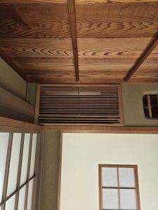 令和6年11月(由布市)某旅館のエアコンの取替工事を行いました。急に寒くなっていざエアコンをつけてみると動きが悪くなっていることに気づき、急遽取替えるということがよくあります。それで最近はエアコンの依頼が多くなっています。今回取り付けたのは、別売りで和風のカバーがあるタイプで「離れ」の畳の部屋にマッチしたエアコンでした。