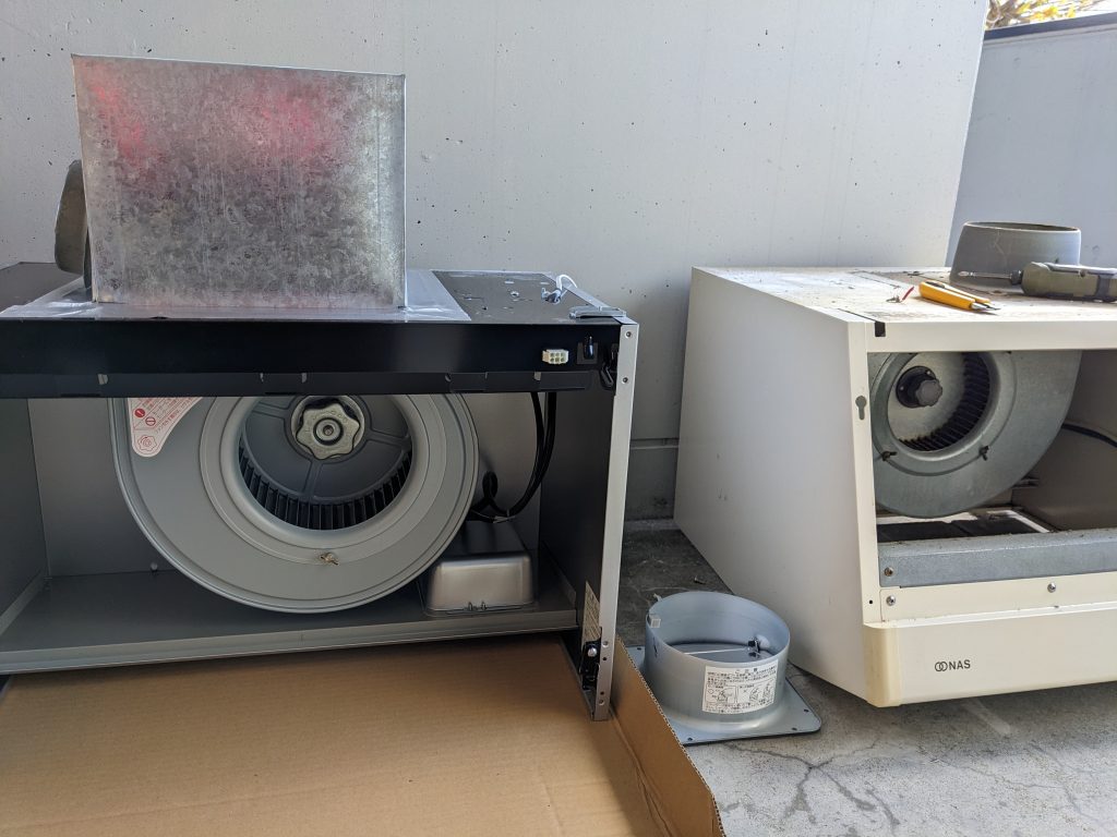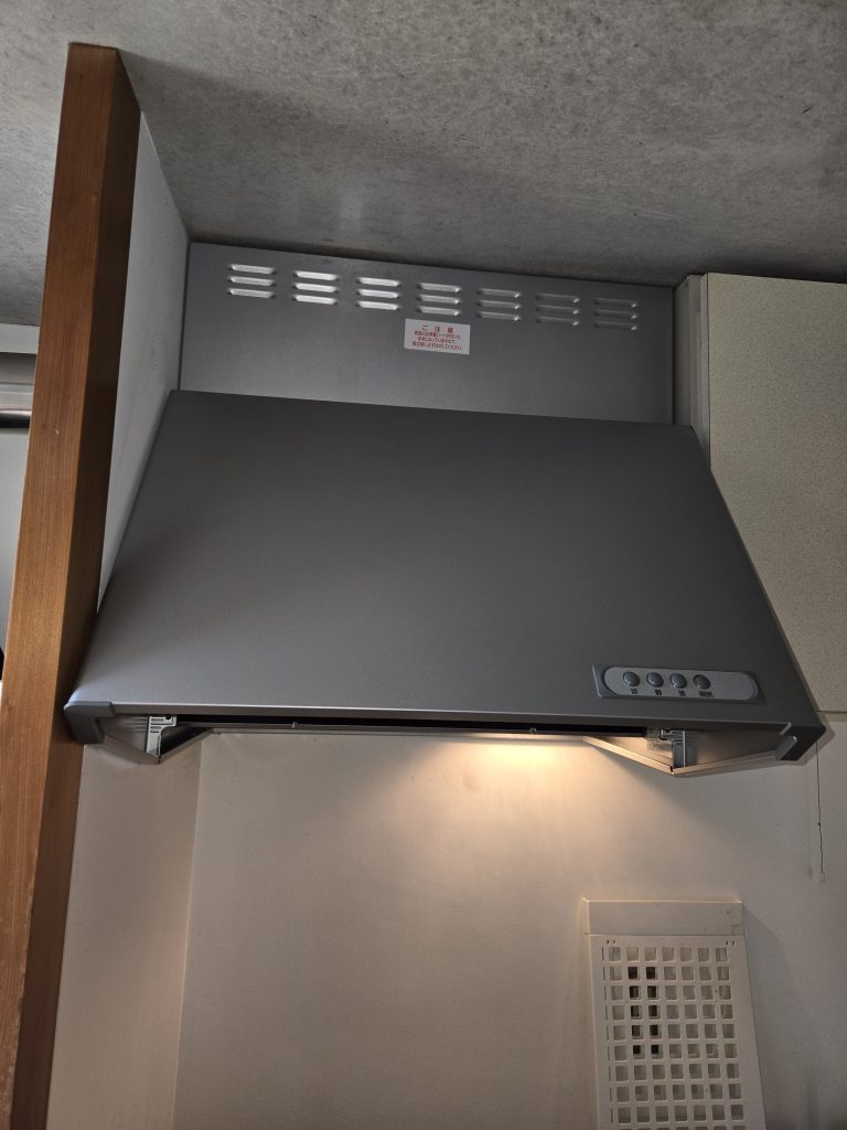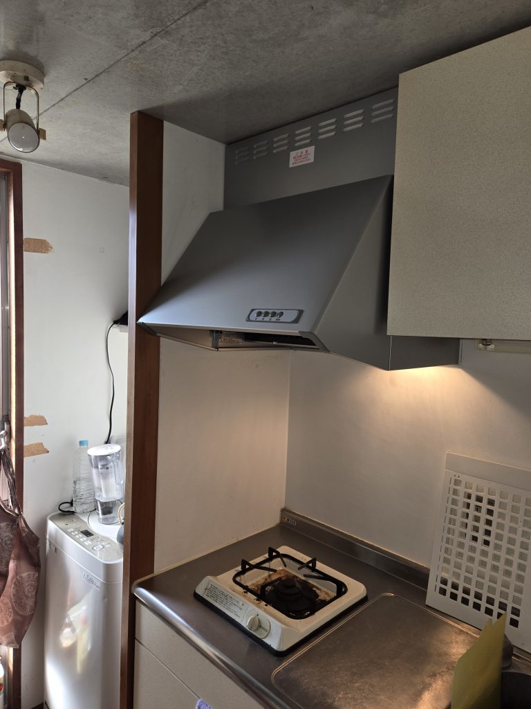 令和6年11月(由布市)某旅館社員寮のレンジフードが故障したので取り替えました。商品が廃盤になると同等の代替品になります。今回は天井までの高さを合わせるために、既存の内部部品を調整して取り付けました。