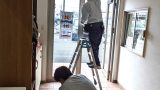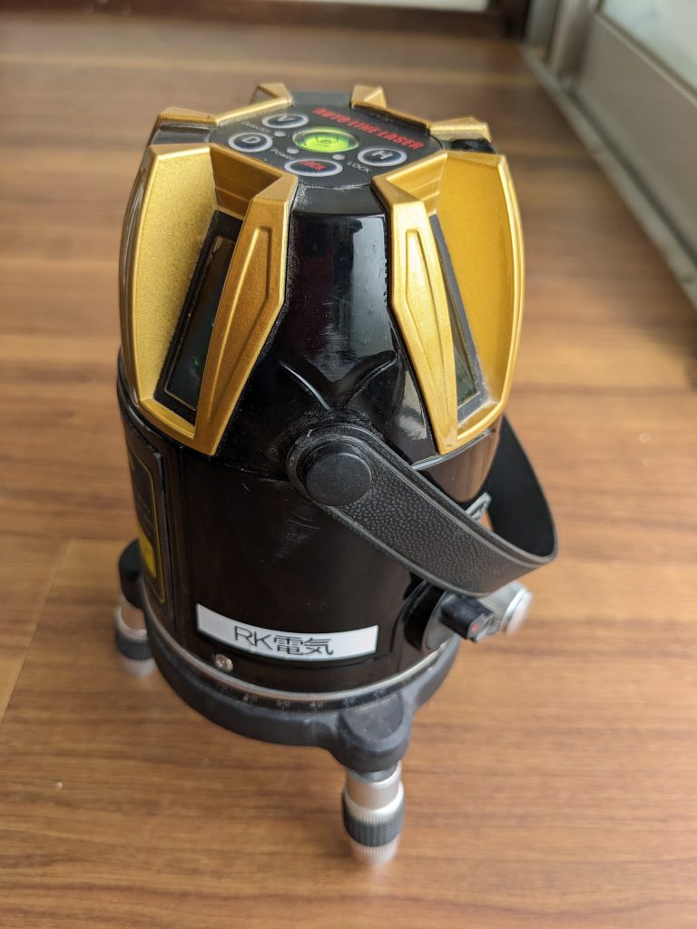 施工事例令和7年4月(由布市)よく工事依頼をいただく老舗旅館の食事処のテーブルを配置換えしたため、照明器具を移設しました。テーブル中心のちょうど真上に来るようにレーザーを使って設置場所を決めます。スターウオーズのドロイドのような形をしたとても便利な道具です。効率のよい工事には道具の力も大きいです。