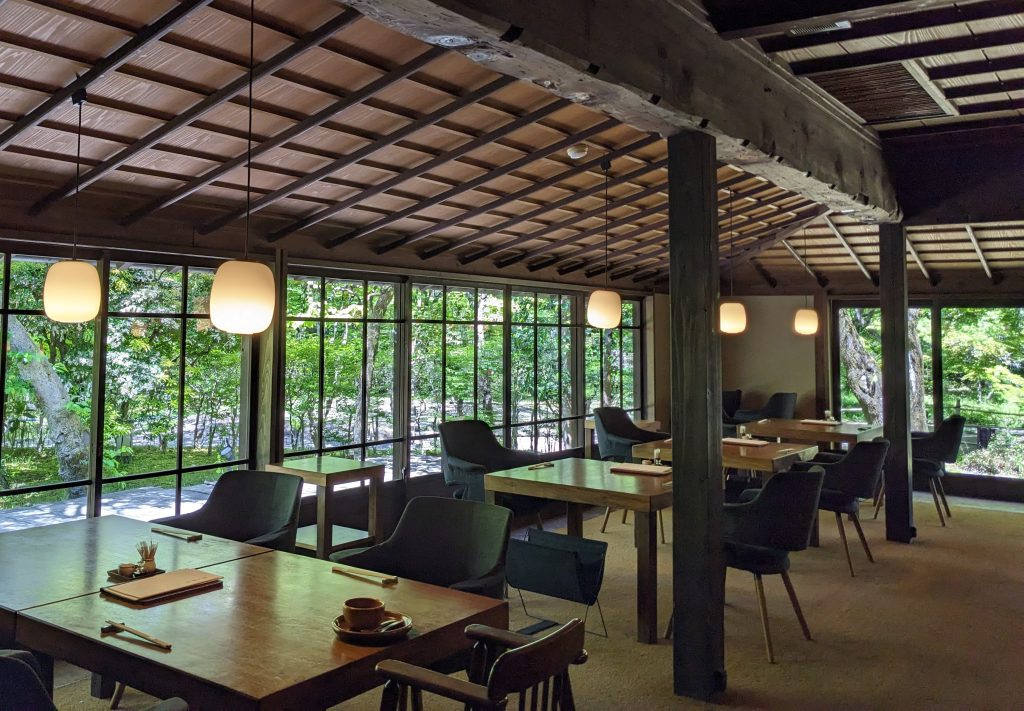 令和7年4月(由布市)よく工事依頼をいただく老舗旅館の食事処のテーブルを配置換えしたため、照明器具を移設しました。テーブル中心のちょうど真上に来るようにレーザーを使って設置場所を決めます。スターウオーズのドロイドのような形をしたとても便利な道具です。効率のよい工事には道具の力も大きいです。