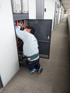 某アパート兼スポーツ施設で年に2回の定期消防点検を実施しました。室内にある3か所の探知機を1つずつ確認していくので、居住されている方のご協力のお陰で点検ができます。また、通路などの共用部分も確認を行い、異常もなく安心しました。万が一の時に作動しないと命に関わるので、今後も定期的に点検を行います。