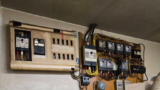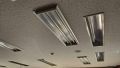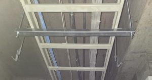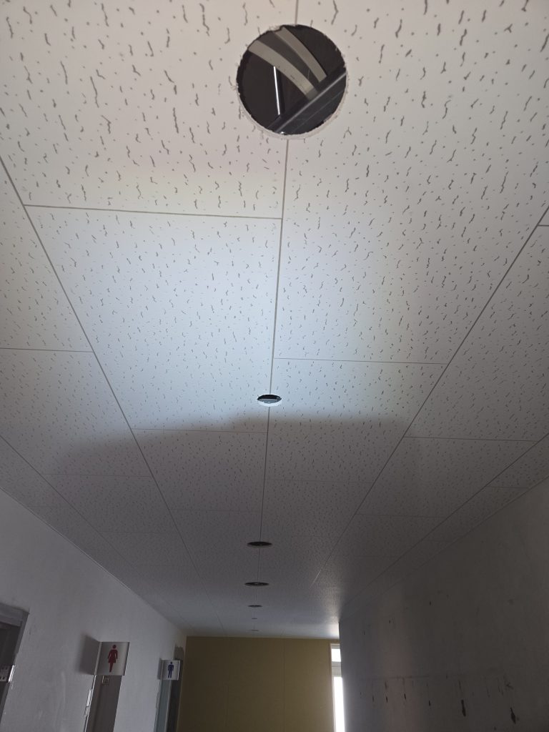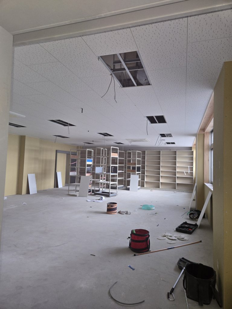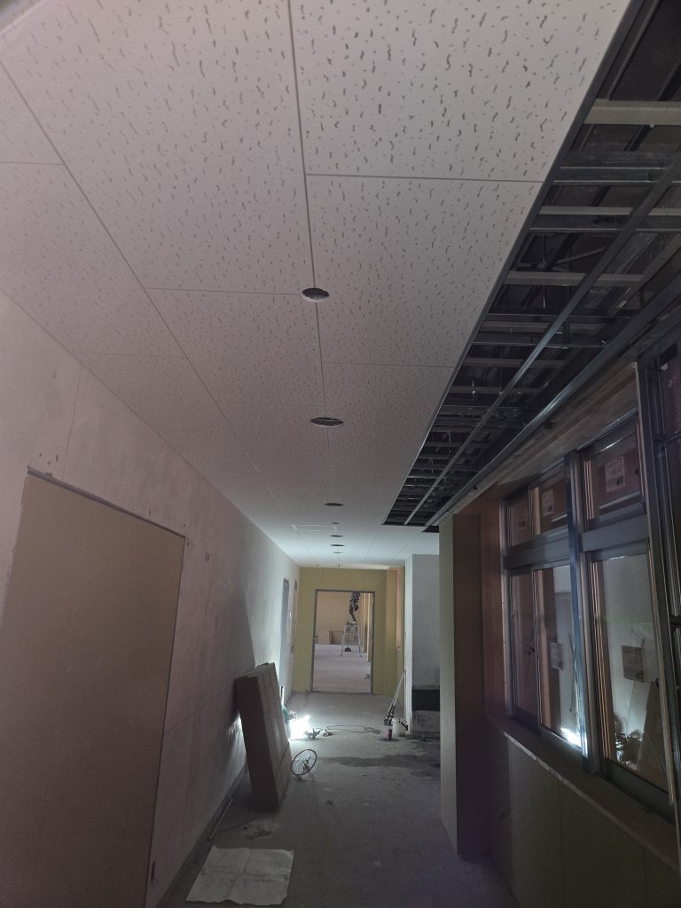 令和7年2月(大分市)某小学校の校舎改修電気工事は順調に進んでいます。3階建てのほとんどの室内の天井が貼られて、照明器具の取付ができるようになりました。3月は廊下の器具取付と盤設置があります。壁が出来れば、コンセントやスイッチの取付も行います。