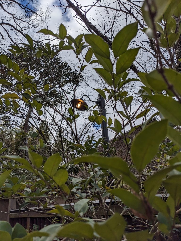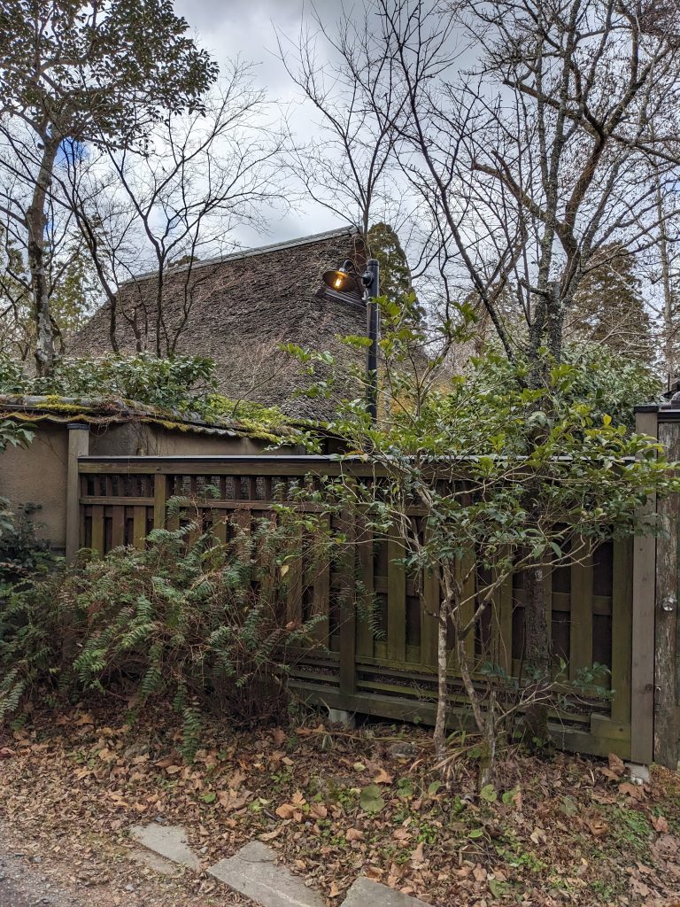 令和6年12月(由布市)某老舗旅館の通路にある街路灯を付け替えました。もともとあったものとよく似たレトロな雰囲気の照明器具を探すことができました。後ろの茅葺屋根ともマッチしていて、ノスタルジックな温かい灯に心癒されます。
