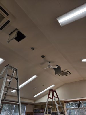 令和6年11月(大分市) 市内にある地区公民館の図書室の天井にシーリングファンを取付けました。この図書室の天井はとても高く、エアコンが効率よく効いていないというご依頼があったので、ファンを設置することにしました。夏はエアコンの冷たい空気を上...