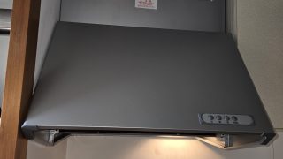 令和6年11月(由布市)某旅館社員寮のレンジフードが故障したので取り替えました。商品が廃盤になると同等の代替品になります。今回は天井までの高さを合わせるために、既存の内部部品を調整して取り付けました。